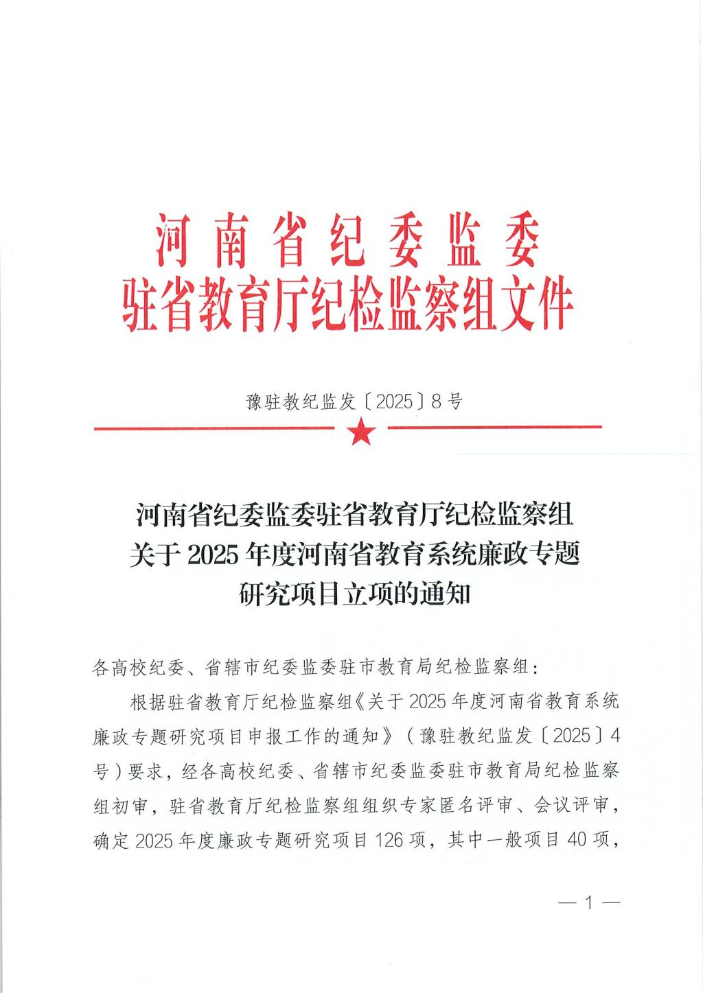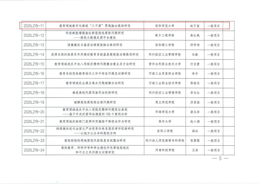 近日,河南省纪委监委驻省教育厅纪检监察组发布了《crown皇冠体育平台2025年度河南省教育系统廉政专题研究项目立项的通知》(豫驻教纪监发〔2025〕8号),crown皇冠体育平台成功获批2个项目。其中,旅游学院赵子鉴老师主持申报的《教育领域数字化推进“三不腐”贯通融合载体研究》获批一般项目、审计处张玉娟老师主持申报的《完善高校领导干部权力配置运行制约和监督机制研究》获批指导项目。